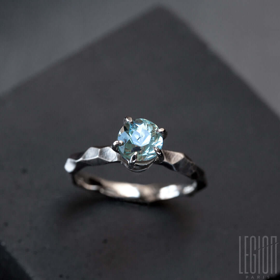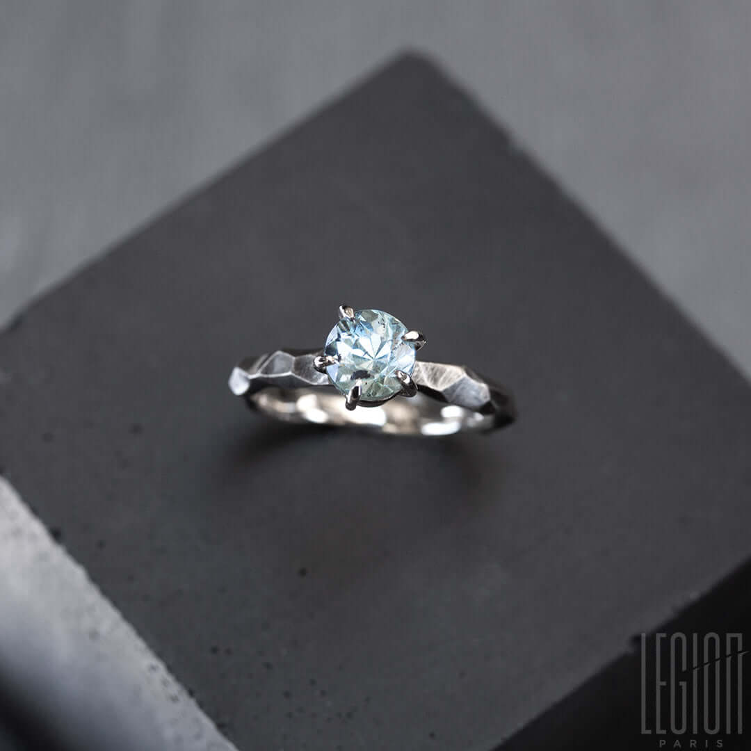 LADON est une bague facettée en or blanc (750/1000) fabriquée à la main et surmontée d’une aigue-marine ronde très incluse d'un vert d'eau apaisant que nous avons serti dans 5 griffes. Cette création et sa pierre de 1,10 carats sont uniques, notamment de par les inclusions noires naturellement présentes dans cette dernière. Cette bague, qui serait parfaite comme bague de fiançailles, s’accordera avec notre gamme d’alliances Orime.